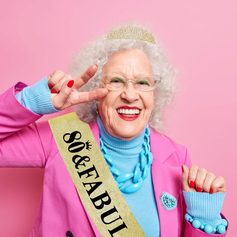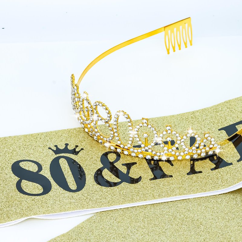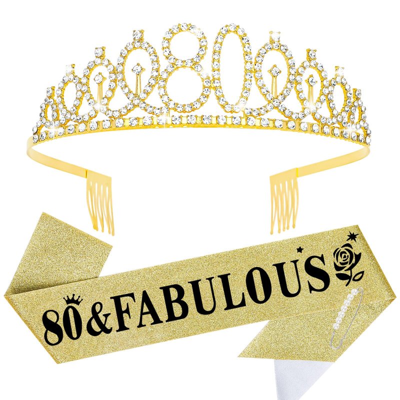 - Perfect for Birthday Party Set: "80 & Fabulous" gold satin sash and a gold rhinestone crown with a beautiful pearl pin. When worn, the Queen's temperament is immediately apparent and the crowd will be dazzled.