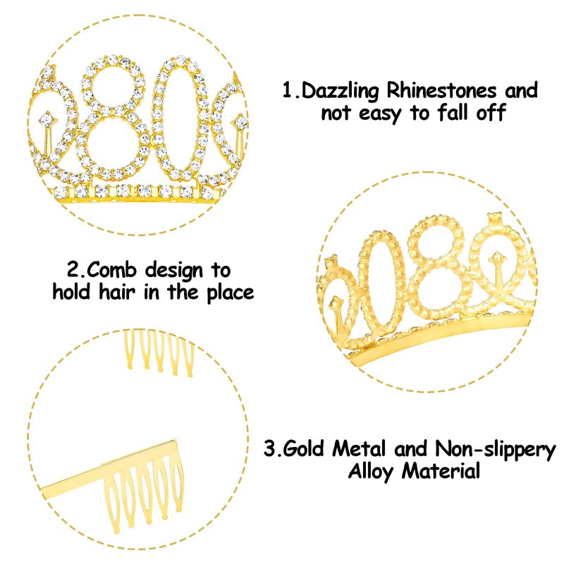 - Premium Materials: The crown measures 5.51 inches in diameter and 2.36 inches in height. The "80 & Fabulous" sash measures 3.54 inches wide and 31.49 inches long. The birthday tiara is made of durable sturdy alloy and rhinestone, high quality rhinestones are paved on alloy tiara which is bright and glorious.