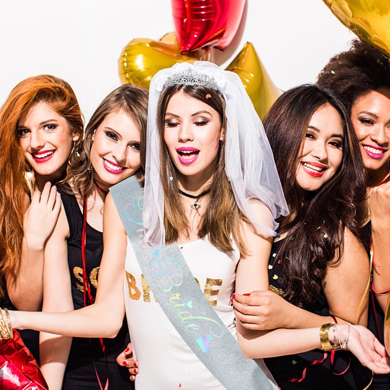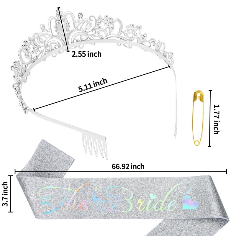 - Bachelorette Party Supplies: Package includes 1 silver bridal crown and 1 “The Bride” sash, a must-have set for bachelorette party! The Bride sash is made of soft glittery fabric with hot stamping to match any outfit, colorfast and durable.
