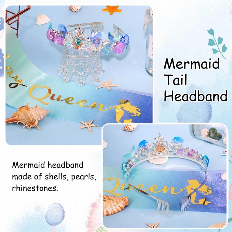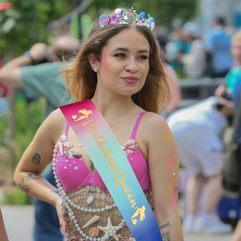 YARIEW Mermaid Birthday Crown and Birthday Queen Sash Mermaid Birthday Decorations Mermaid Party Decorations for Girls Birthday Sash for Women Mermaid Birthday Party Decoration