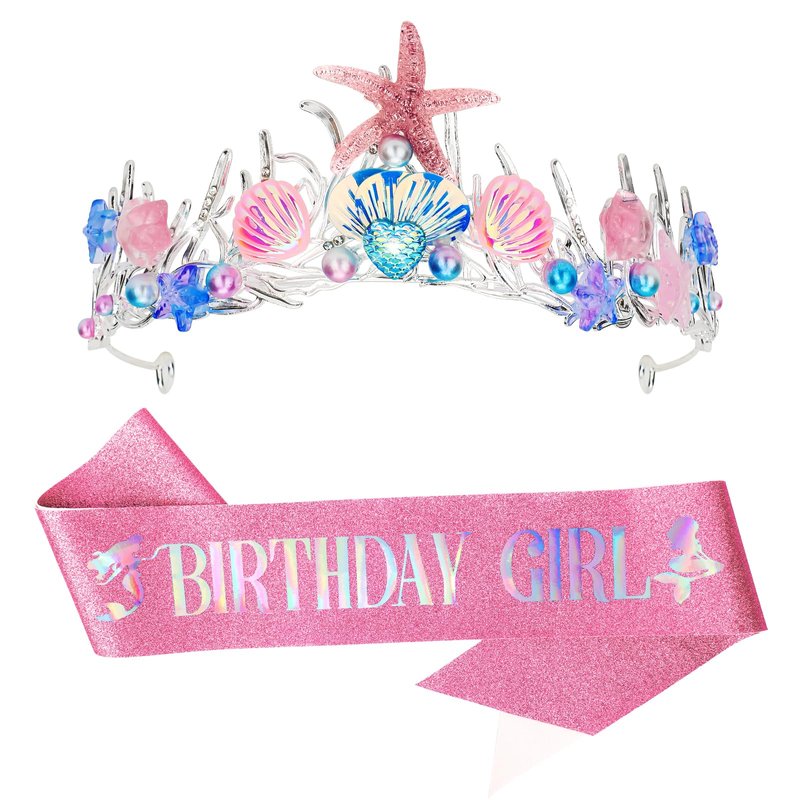YARIEW Mermaid Birthday Decorations Mermaid Crown and Birthday Sash Mermaid Party Decorations for Women Birthday Crown Tiara for Women Halloween Costume Gifts