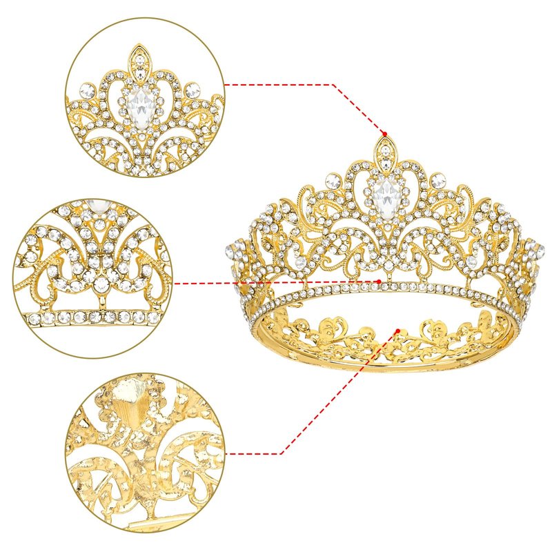- ★EXCELLENT MATERIAL★: Gold crown measures 4.33 inches in diameter and 1.96 inches in height. The gold tiara is made of sturdy and durable alloy and rhinestones. The alloy tiara is set with high-quality rhinestones for brilliance.