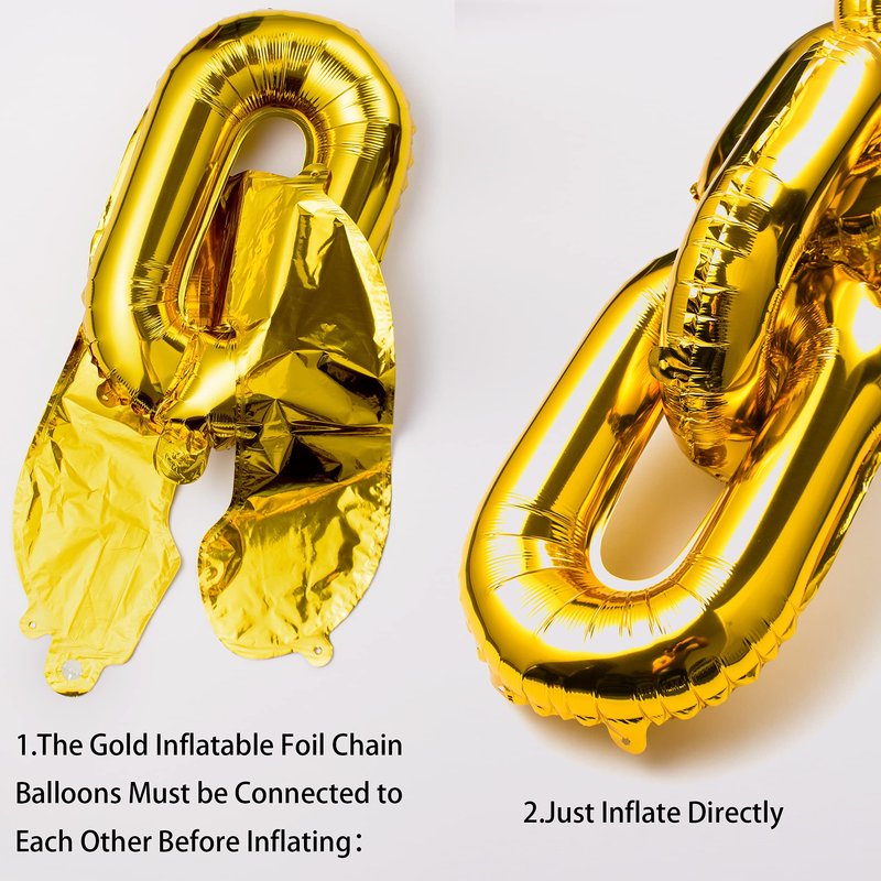 Charming Gold Chain Balloons: These foil chain balloons can help you make 80s party photography backgrounds, easy to inflate, and fast connection; you can use them for arches and doorways, and connect them along the ceiling and walls. Please note: it will be easier to connect the chain-link balloons first and then inflate them.