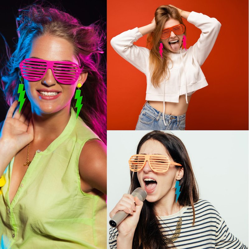 - ★【Plastic Shutter Glasses with Foil Chain Balloons】- Our 6Pcs colorful shutter sunglasses are great as party favors as a rock element to decorate a party space, and gold foil chain balloons can quickly link up. The shutter shading glasses width approx. 14cm/ 9.8inch and the 16inch gold foil chain balloons, ideal for your 80s 90s parties and hip-hop party and fun cosplay or Halloween DJ costume.