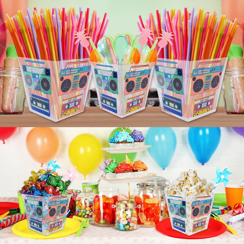 - ★【Unique Desk Holder】- Our popcorn buckets were essential items for party buffets in the 1980s/1990s, and you can fill these boxes with candy, potato chips, popcorn, and party gifts. It guarantees to add fun to your dining table in your upcoming hip-hop party decor or vintage 80s 90s parties. It can also serve as a makeup bucket on your makeup table; It can also be used as a reusable pen holder on your desk.