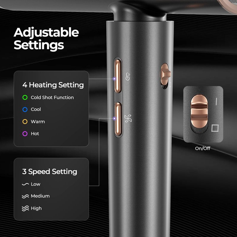 - Adjustable Settings for Customized Drying: Enjoy precise control with four heat settings (Cold Shot Function, Cool, Warm, Hot) and three speed settings (Gentle, Medium, Fast). The LED Color Ring display simplifies adjustment for different hair types, offering a personalized drying experience