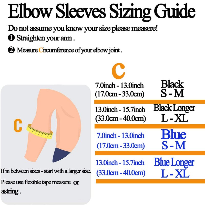 SIZE: MEASURE AROUND THE ELBOW. ※ COLOR: (Black: S - M) SUITABLE FOR 7.0 INCHES - 13.0 INCHES ELBOW. COLOR: (Black: longer - Xlonger ) SUITABLE FOR 13.0INCHES - 15.7INCHES ELBOW. (Please take a look at our sizing chart and measure your circumference based on our instructions!)