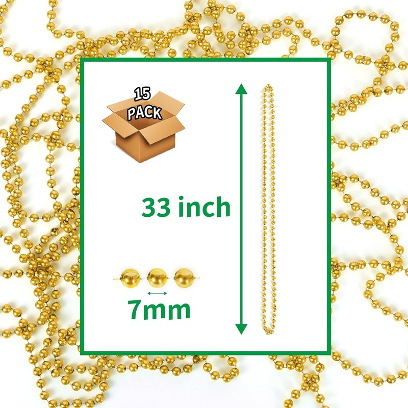 YAXINRUI 33 Inch 7 mm Metallic Gold Bead Necklaces, 15pcs Mardi Gras Beads Bulk Round Beaded Necklaces Costume Necklace for Mardi Gras Party Christmas Festive Events, Party Favors