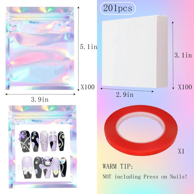 - [201 Pieces Press on Nail Packaging Bag Set ] You will receive 100 Holographic Ziplock Bags, 100 sheets of white cardstock, a roll of 3 meters of clear double sided tape (if the tape is not enough, you can buy it separately), plenty of quantity, perfect for your daily use.