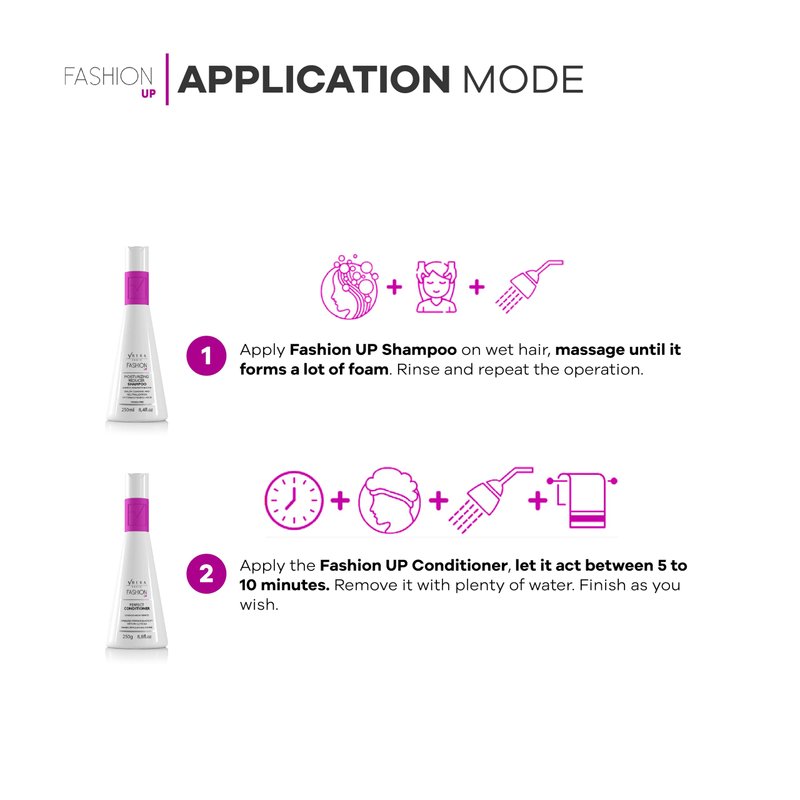 - BRAZILIAN HAIR TREATMENT; Our treatments are unique formulas with high quality ingredients that allow you to have shiny, smooth, silky hair; The Fashion UP Home Care System can be used at home daily, its application is fast and comfortable; The set includes, 1 Shampoo 8,4 Oz and 1 Conditioner 8,8 Oz