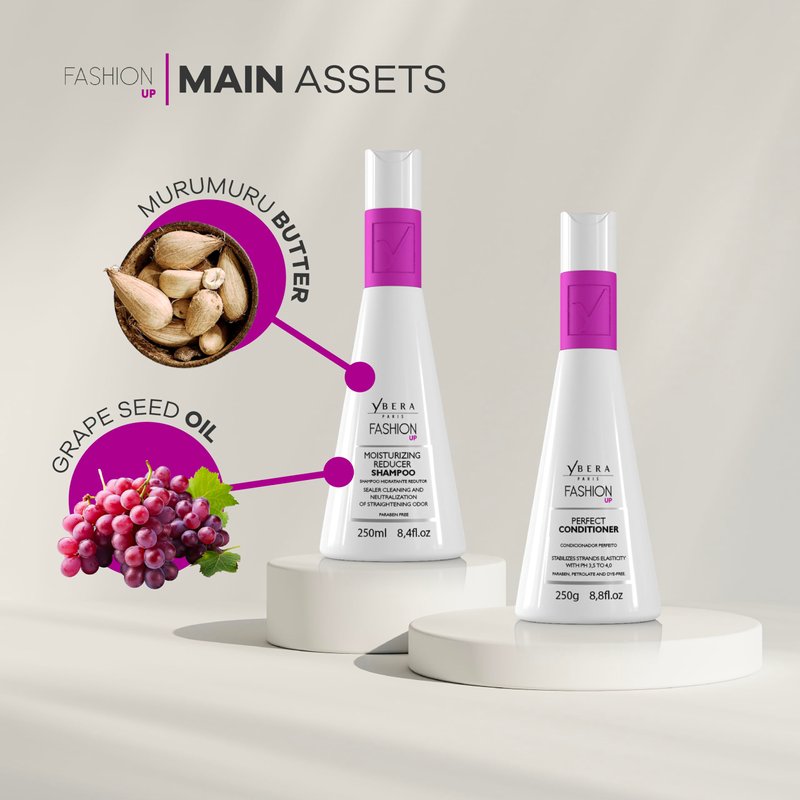 Its exclusive and innovative formula is ideal for the maintenance of smoothing as it is free of sulfates and parabens; the formulation is rich in oil of grape seed and Murumuru Butter; the Murumuru is a seed of a typical Brazilian palm tree, of the oil of this seed is produced a butter which has impressive benefits for dry hair and with a lot of volumes; APPLICATION MODE, Apply the Fashion UP Shampoo to wet hair, massage to form abundant foam; Rinse and repeat operation; Apply the Fashion UP Conditioner by the wick and leave it on for 10 minutes; Remove with plenty of water; PRODUCT, 1 Fashion UP Moisturizing Shampoo 8 fl, Oz 1 Fashion UP Conditioner Reducer 8, fl Oz NUMBER OF APPLICATIONS Aprox 15 applications