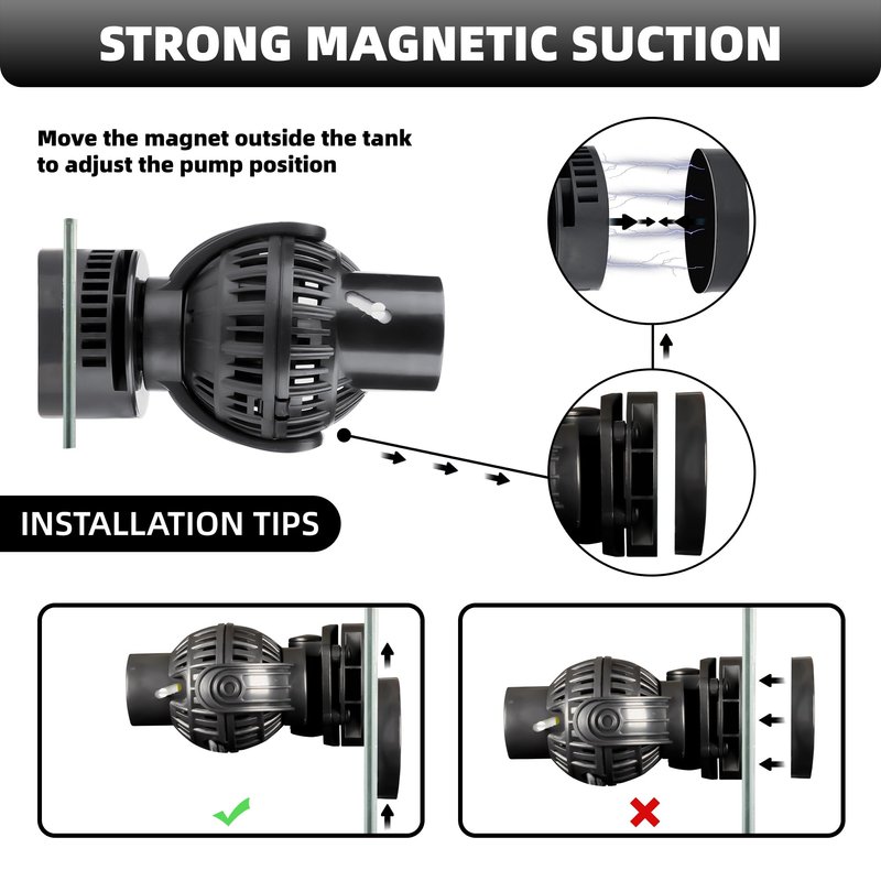 - Strong magnetic suction cups: The aquarium circulation pump is equipped with a strong magnetic bracket, the strong magnet can fix the surf pump firmly anywhere in the fish tank (thickness less than 15mm). The stable magnetic base reduces noise when running and prevents the pump from falling off