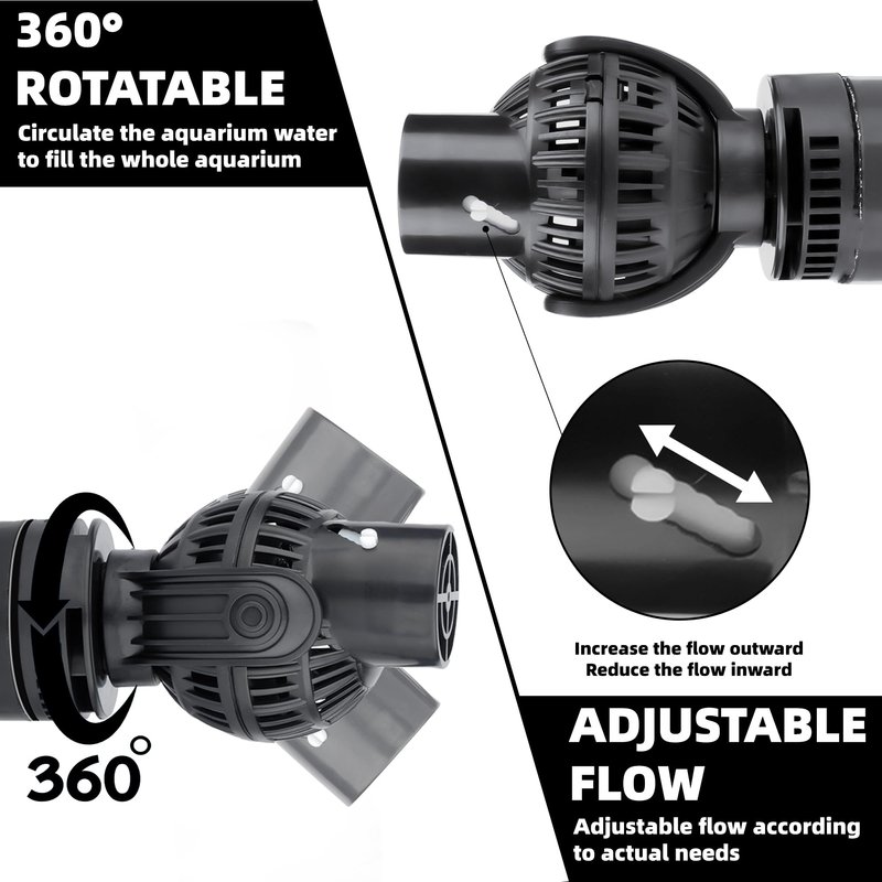 - 360°+270°Free rotation: The fish tank wavemaker can freely adjust the wave direction: 360° horizontal + 270° vertical adjustment. Compared with traditional wave pumps, our wave pumps are more flexible. No dead corner, anti-reverse, protect the motor from damage. Environmental protection materials avoid pollution to the living environment. Small and exquisite, not easy to damage