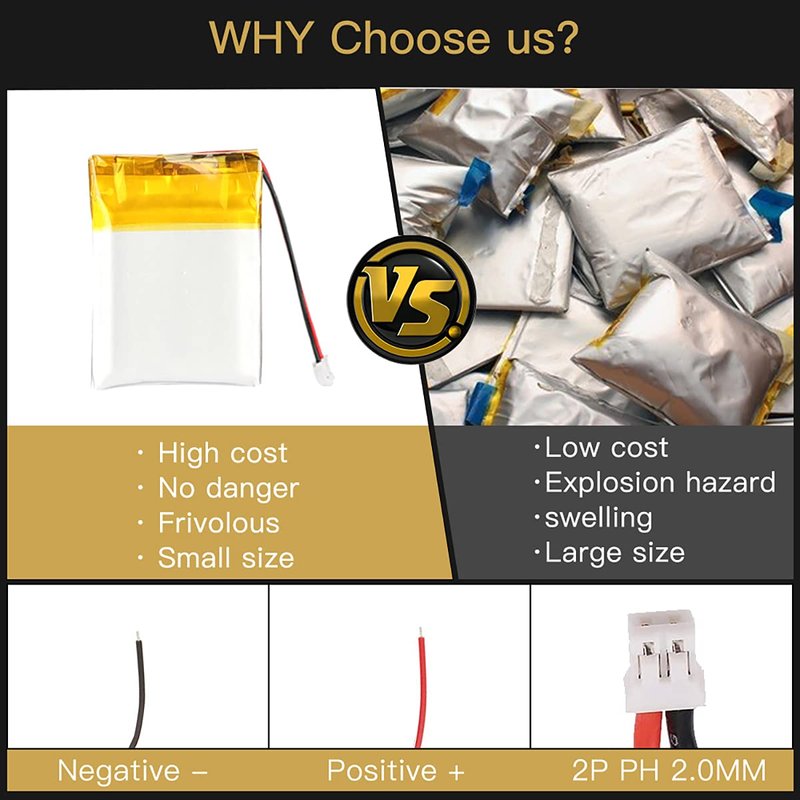 2.Our rechargeable lithium polymer ion battery connectors types are all JST PH2.0mm. Before ordering, please make sure the battery size and connector fit your battery.