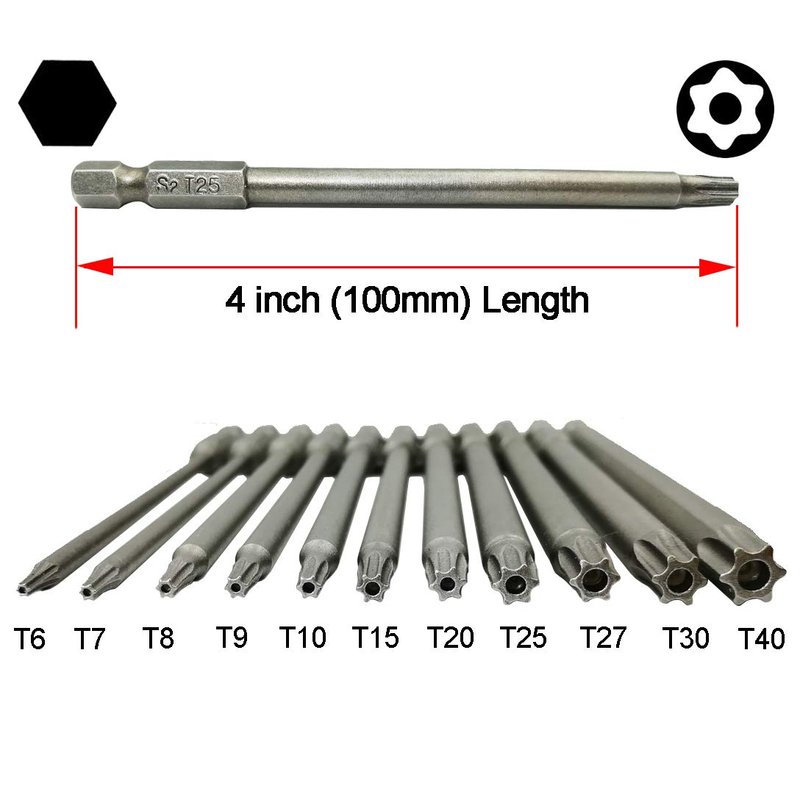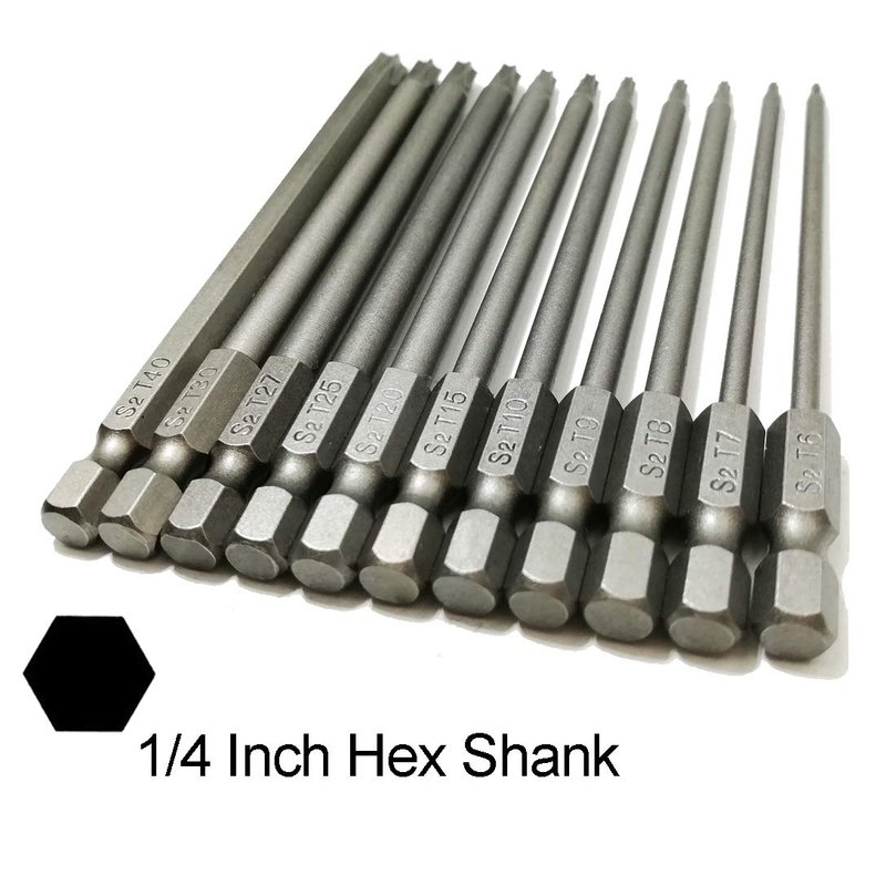 YDLQWCZ Long Torx Security Head Screwdriver Drill Set 1/4 Inch Hex Shank T6 T7 T8 T9 T10 T15 T20 T25 T27 T30 T40 11 Pieces 4 Inch Length S2 Steel Torx Screwdriver Bit Set (11pcs Torx Head 100mm)