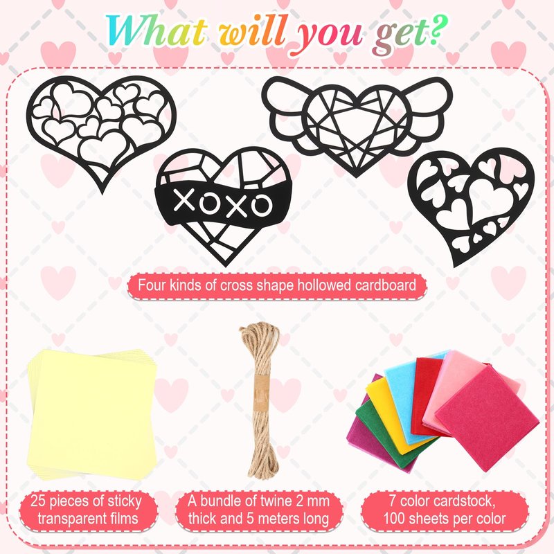 - Package Includes: this suncatcher arts and crafts include 24 pcs hollow cards, 700 pcs colored tissue paper in 7 colors ( 100 pieces for each color) , 25 pcs transparent viscous films and 16.4ft long hemp rope, a thoughtful combination to support your various DIY activities