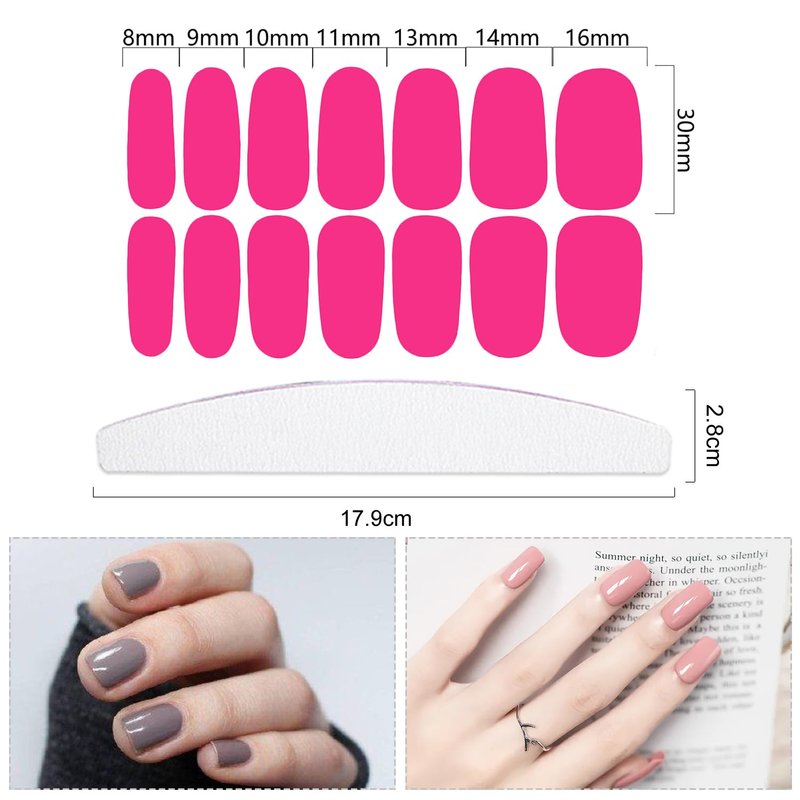 - [What you get]: Package content 24 sheets pink series solid full nail wraps in different color and sizes, each sheet contains 14 pcs, totally 336 pcs, together with 1 piece moon shape nail file, sufficient to meet your DIY nail decoration needs