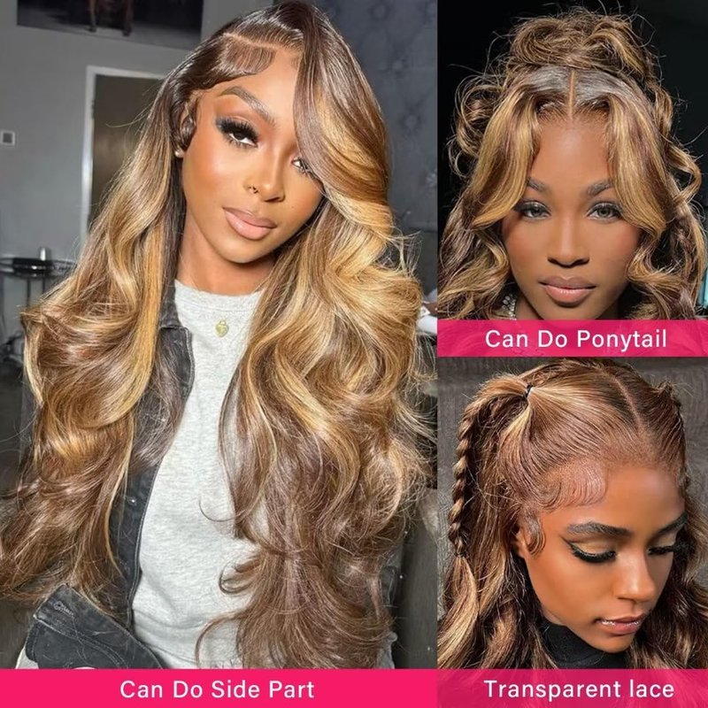 - Highlight Lace Front Wigs Human Hair Material:Honey blonde body wave wig,100% unprocessed brazilian virgin human hair cut from young girl, healthy and vibrant,no shedding no tangle,180% density, full and thick, natural and healthy,soft and bouncy