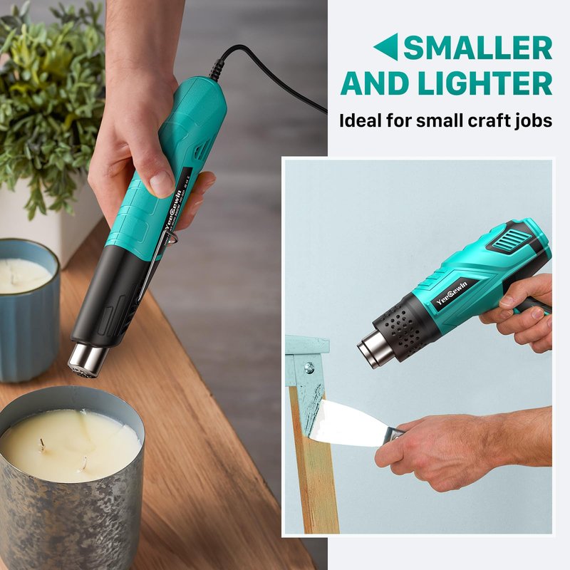 - ►【High Quality & Wide Application】The heat gun is made of high quality ABS plastic shell and stainless steel air outlet, which are resistant to high temperature, corrosion and long-lasting service life. The pure copper motor provide you a low-noise environment and compared with traditional ones, it can save more power. If you like DIY, it is an excellent small tool. Perfect for resin, embossing powders, shrink wrap, vinyl wrap, decals, jewelry making, candle making.