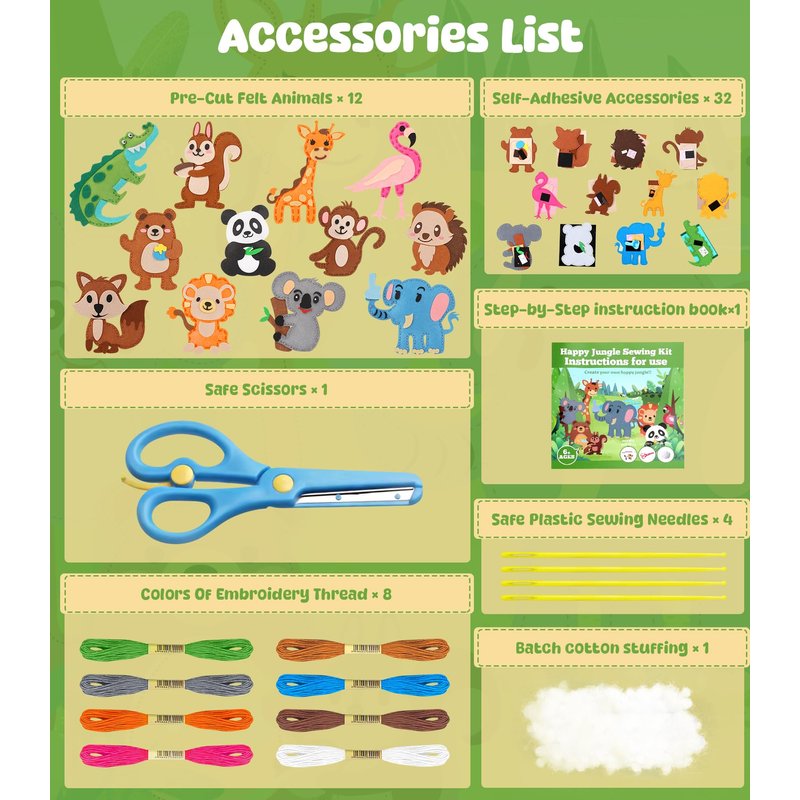 - Contain 200+ Piece Set: Sewing kit for kids includes everything you need to create 12 stuffed animal projects, come with 12 pre-cut holes felt animals, 32 self-adhesive accessories, 8 colors of embroidery thread, 4 safety plastic sewing needles,1 safety scissors, 1 batch of cotton stuffing, 1 step-by-step instruction book.