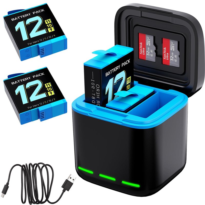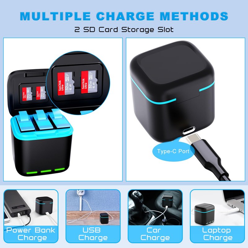 - 【Storage Design Charger】3-Channel unique and compact Charger designed with a closed lid with 2 SD card slot, can storage and charge 2-Pack Hero 12/ 11/ 10/ 9 batteries simultaneously. The cover of the charger has a magnetic suction design. And the battery charger staion with Smart LED Indicator Light, Red for charging, Green for charging completed.