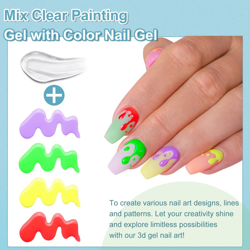 - Infinite Creativity: Unleash your artistic flair with our clear 3D painting gel, designed to blend seamlessly with a spectrum of gel nail polish and chrome nail powder. Craft distinctive designs, intricate lines, and captivating patterns, allowing your imagination to run wild in 3D gel nail art.