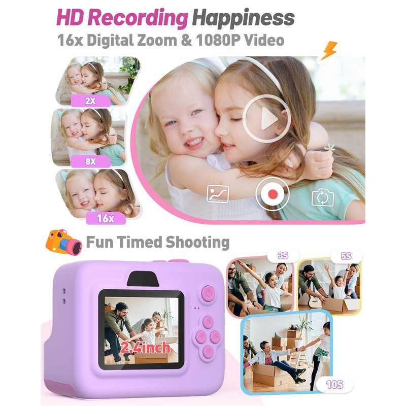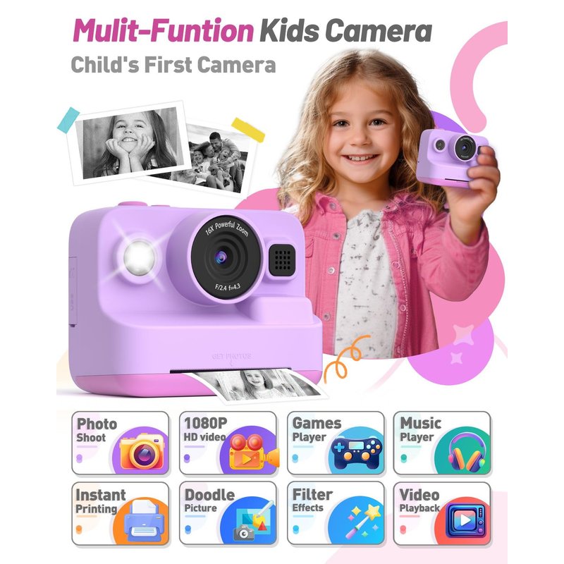Yehtta kids instant camera is equipped with a 2.4-inch IPS screen, clear 1080P high resolution video, 16x digital zoom, black and white instant prints, color photo shooting, continuous shooting, time-lapse, and filters, flashlight,as well as a built-in MP3 player and 4 fun kids' puzzles
