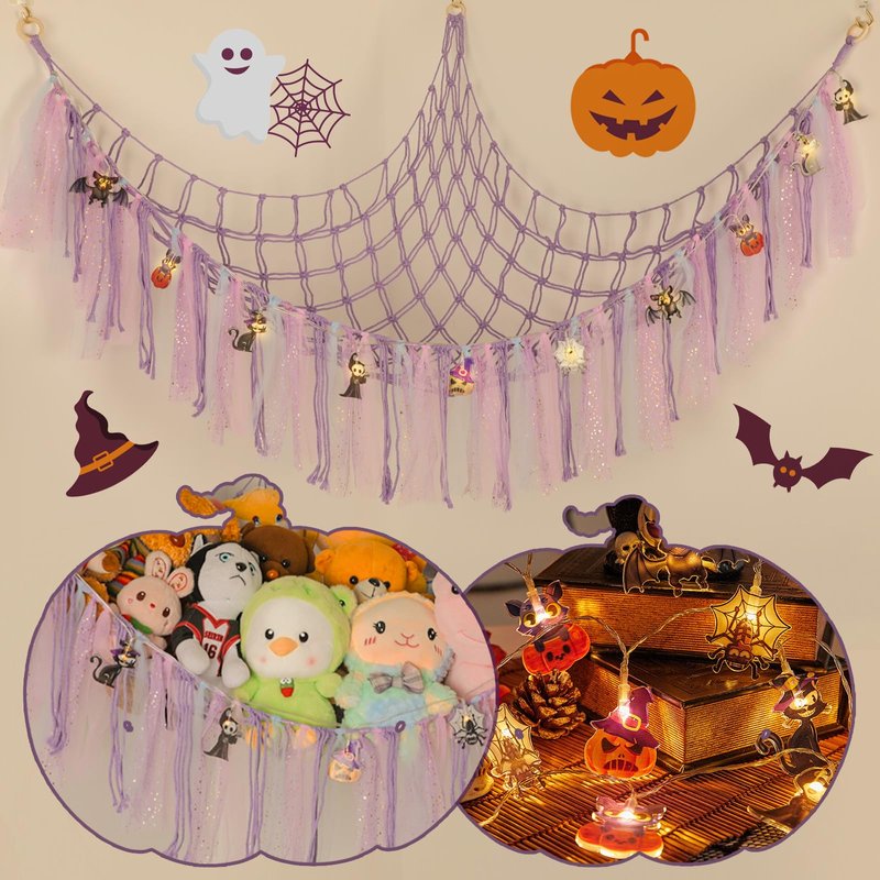 - Spook-tacular Halloween Toy Hammock with Light Strings: Decorated with Lively Tassels and Fun 3D Shapes like Pumpkins, Ghosts and Spiders, Perfect to Store Your Kid's Toys and add a Festive Touch to Your Home Decor.
