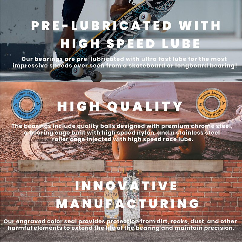 Have you tried bearings that fall apart after just a few uses? Or found that you have to sacrifice performance and durability for less expensive bearing brands? Well look no further because more people choose Yellow Jacket Bearings than any other because they are durable, high performing, and most importantly easy on the wallet. Quality Balls designed with premium chrome steel for smooth gliding and optimal performance. Bearing cage is built with high speed nylon for greater strength and less friction. The stainless steel roller cage is injected with high speed race lube so the bearings are ready for use out of the box. Most race bearings are priced extremely high but Yellow Jacket Bearings give you the race performance you want for only a fraction of the cost. These bearings have been tested up against all other big name brands and not only did they last longer but they glided further distances at higher speeds. If you are looking for VALUE look no further than Yellow Jacket Bearings. Yellow Jacket Shield is designed to keep out all dust, rocks, and particles that will slow your bearings down over time. Its patented technology is unmatched and with the Yellow Jacket engraving everyone will know the bearings you are rolling!