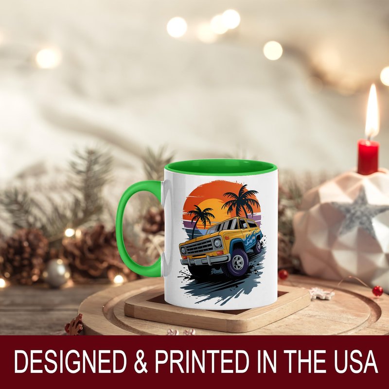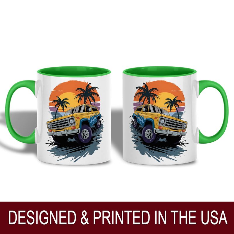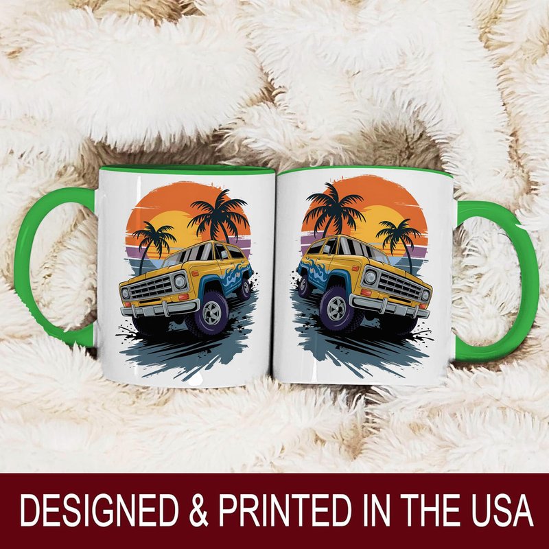 Yellow Off-Road Truck Design Ceramic Mug, 11oz Coffee Cup for Car Enthusiasts, Sunset Beach and Palm Tree Theme, Unique Summer Adventure Gift, Reusable Eco-Friendly Mug for Hot Beverages, Tea, Milk