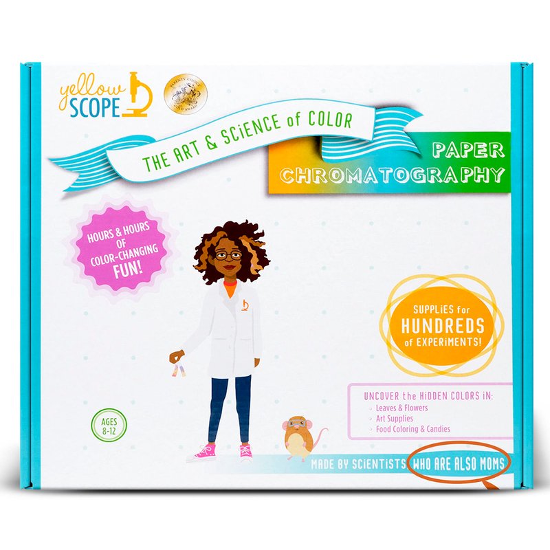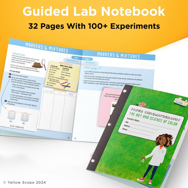 Are you ready to uncover the hidden colors in plants, art supplies, and candies? Our newest paper chromatography kit is here to empower kids with a love for science and creativity! With hundreds of colorful guided experiments, this kit is designed to engage the scientific and creative minds of kids aged 8 and up. The 32-page lab notebook outlines exciting hands-on experiments, making it easy for kids to learn about this scientific technique. And with 10 sheets of scientific chromatography paper (which can make 240 test strips!), 2 beakers, 12 colored markers, green food coloring, dropper pipette, stir stick, 2 wooden dowels, 4 mini clothespins, 5 toothpicks, pencil, and a collectible science pin, there's no limit to what they can discover! At Yellow Scope, we take kids and science seriously. Our science kits are different – they are designed to spark curiosity and foster a love for science in young minds. We believe that with loads of supplies and a little imagination, kids can discover the wonders of the world around them. Yellow Scope was founded by scientists and moms. They met while volunteering at their daughters' school, running family STEM programs. Yellow Scope grew out of their shared passion for science, education, and closing the gender gap in science. With their expertise in science and public health, they have created a range of science kits that are fun, engaging, and educational. Each Yellow Scope science kit is lovingly assembled by hand. We believe in using high-quality materials and ensuring that every kit is thoroughly tested to meet our high standards. We want kids to have the best possible experience with our kits, and we're proud to say that we've had countless happy customers. So why wait? Get your hands on our newest paper chromatography kit and start exploring the hidden colors in plants, art supplies, and candies today!