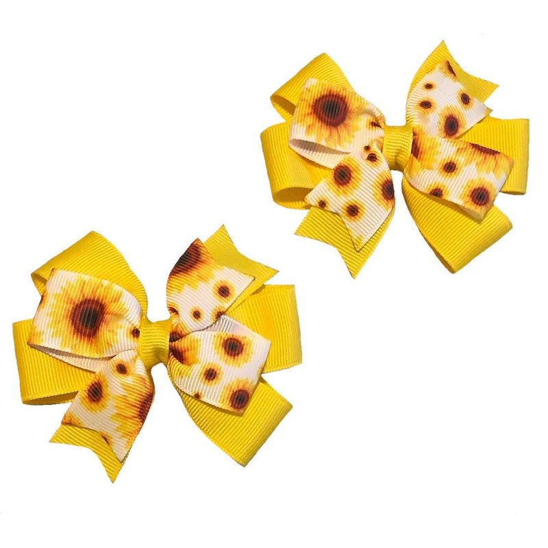 These bows come 2 in a set. They can be mounted on small french barrettes OR partially lined alligator clips. Each set consists of one bow for the right side of the head and one bow for the left side of the head. Each of these bows measure 3.5 inches wide by 3 inches high.