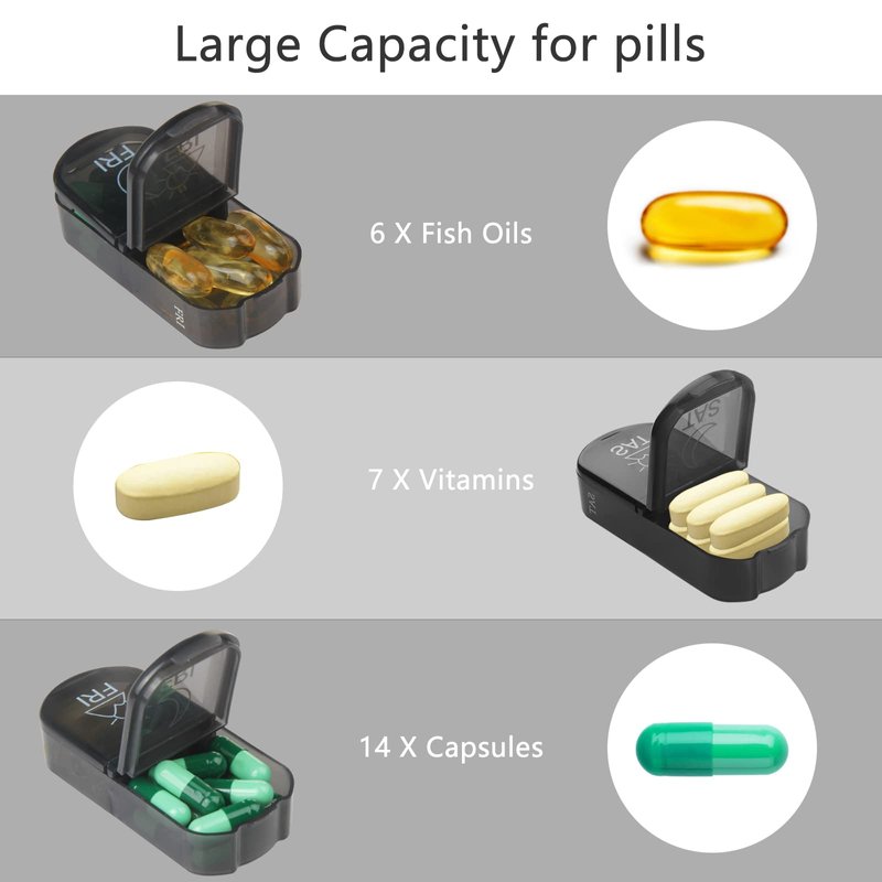 Our pill case was designed with an am&pm conpartment,large capacity ensure you can hold up to 6 fish oils or 14 capsules.