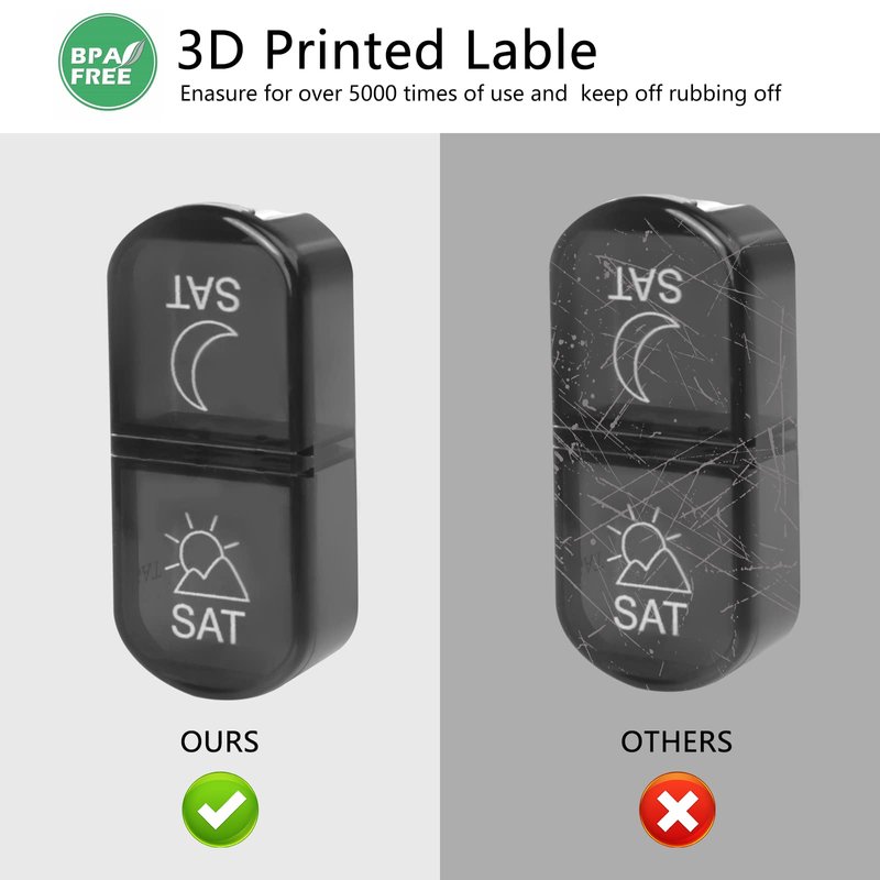 - 💊3D Printing and BPA FREE💊: Our pill box adopt 3D printing to avoid the letters and icons fallong off from the surface. and our pill organizer is made of BPA free material, which is harmless to human body