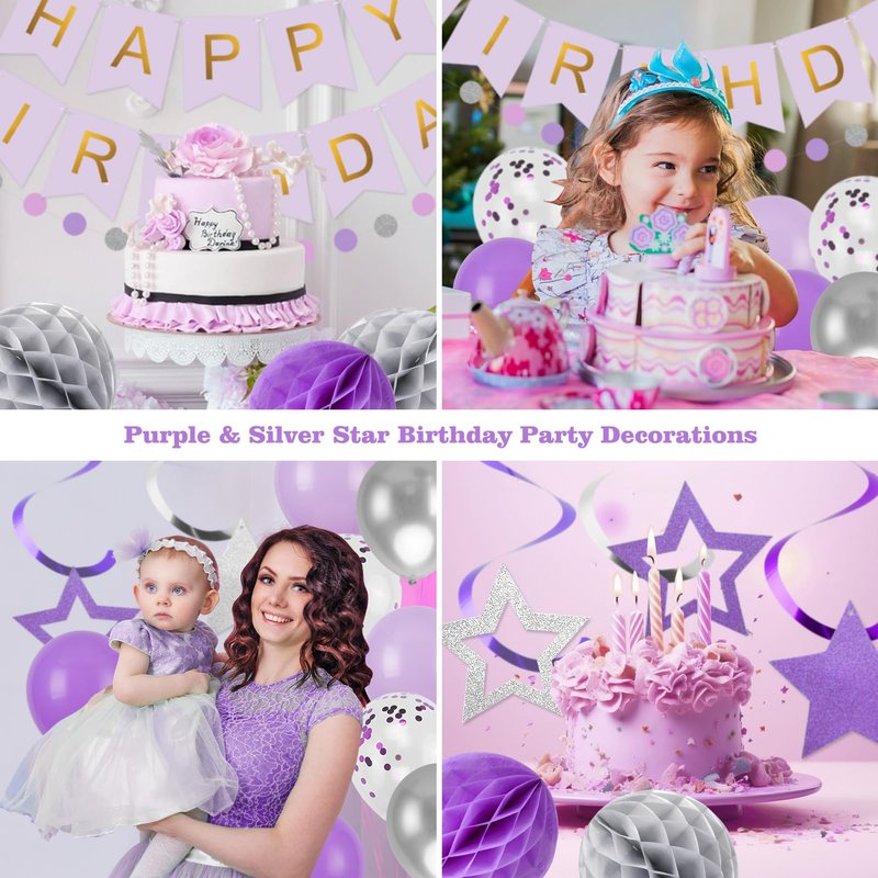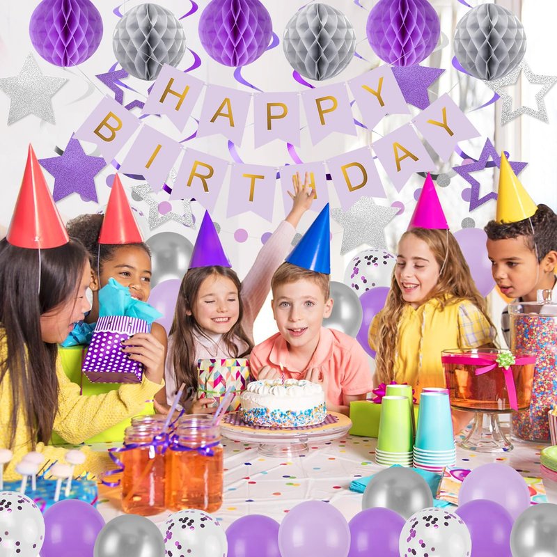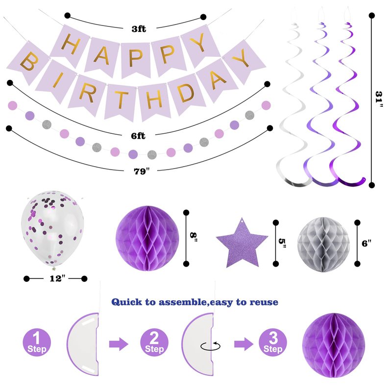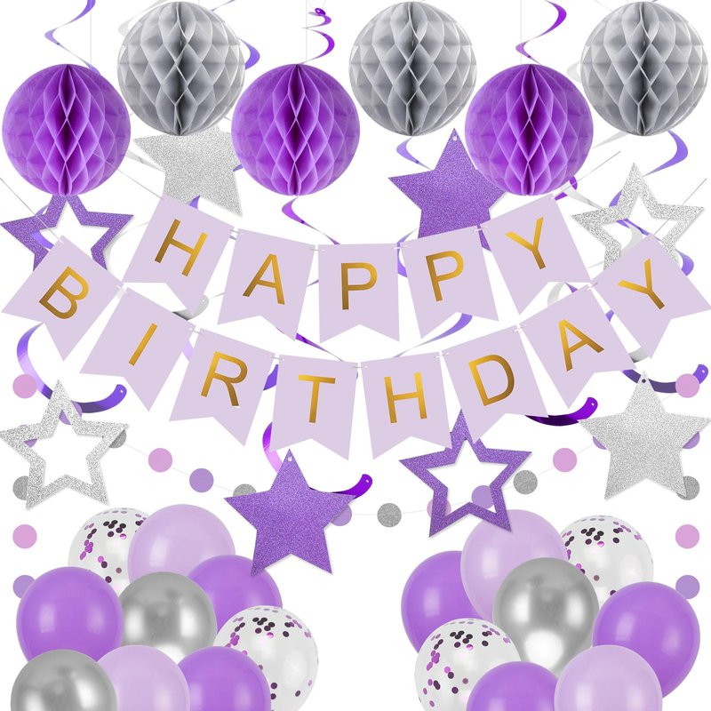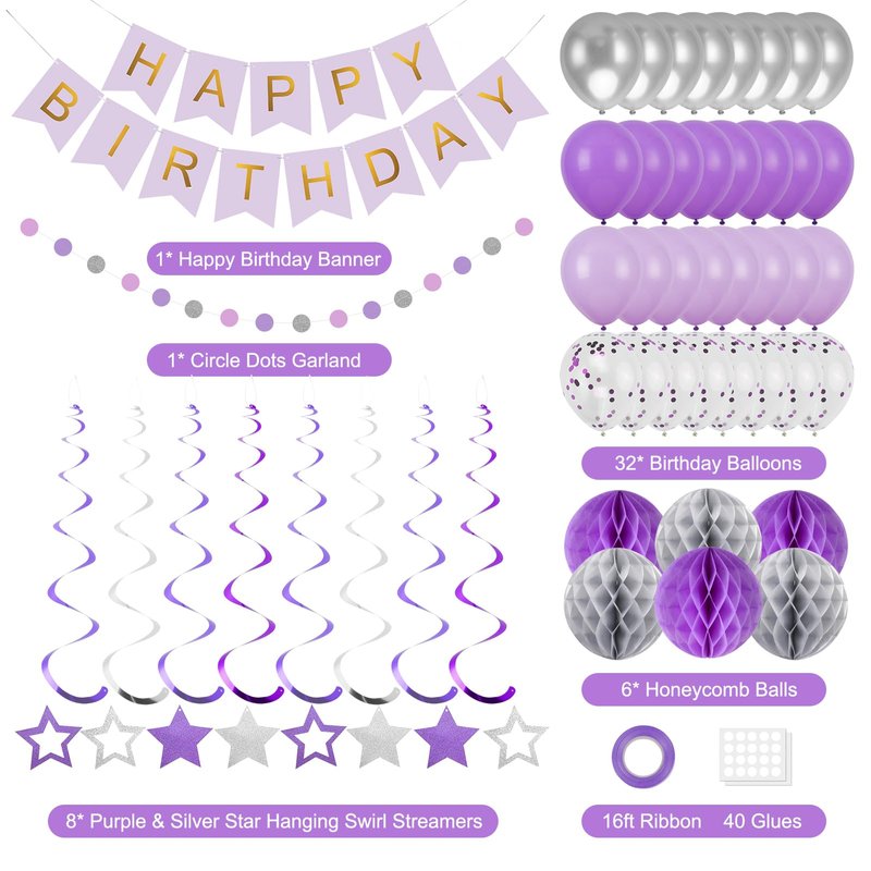 YEOCU Birthday Decorations, Happy Birthday Banner with Birthday Balloons, Honeycomb Balls, Hanging Swirls, Circle Dots Garland, Happy Birthday Party Decorations for Women Men Boy Girl (Purple&Silver)