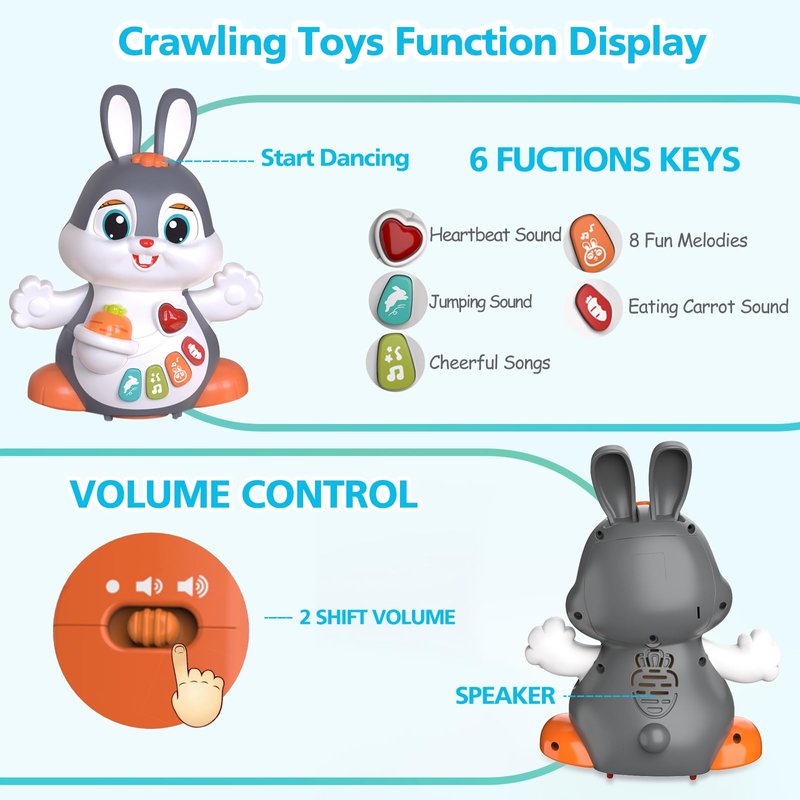 - đ„ăEncourage Baby to Crawl & Build MuscleăIdeal for babies to develop gross motor skills and learn how to control large muscles for walking, running, jumping, and body balance during play. Great baby musical toys and light-up crawling toys. Dancing and moving with happy baby music & lights when pressing the button on the rabbit head. Attracting your baby to chase and crawl. Perfect choice as baby toys for 6 to 12 months