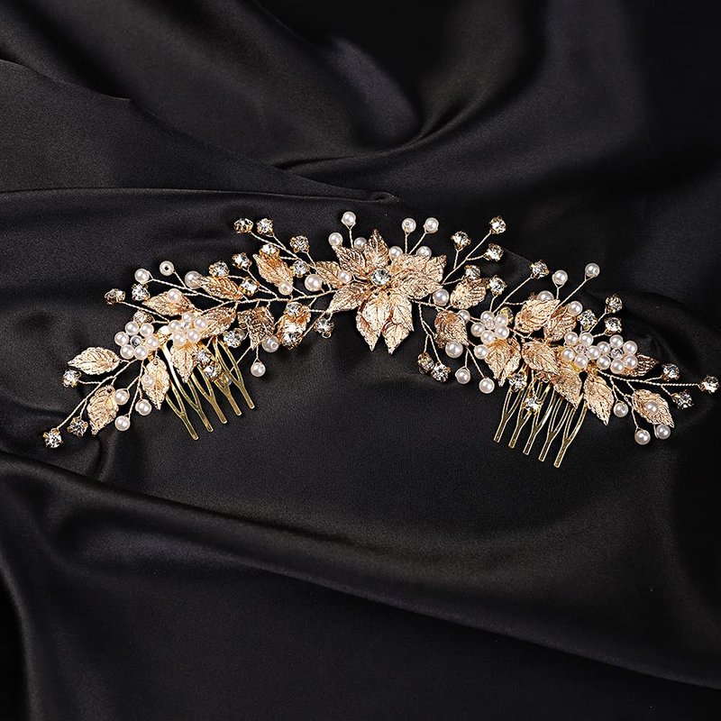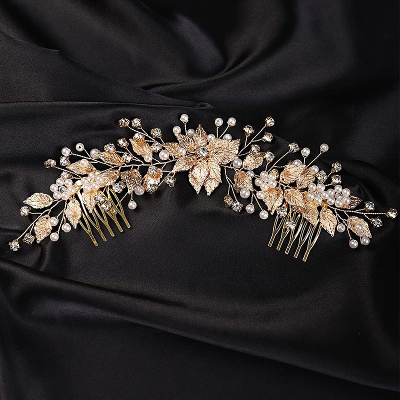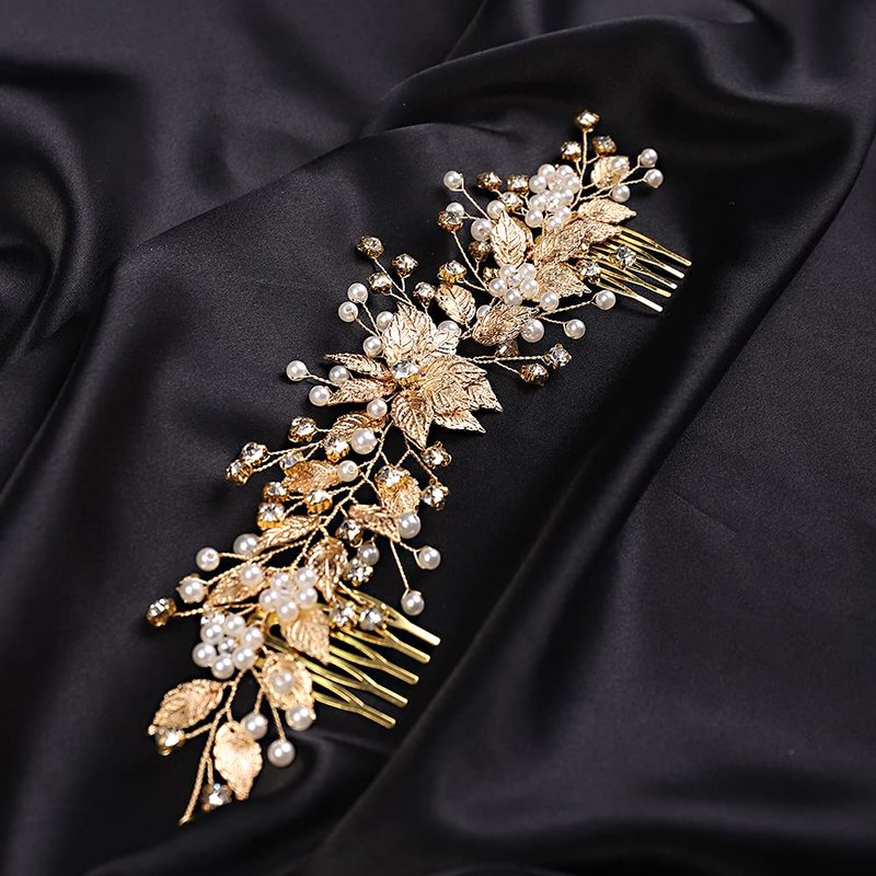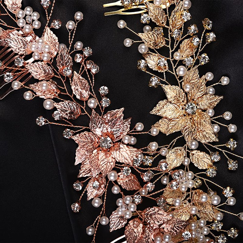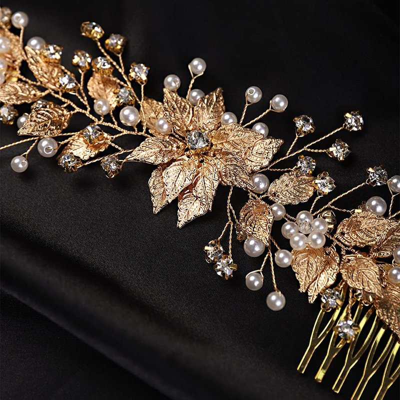 YERTTER Bridal Long Floral Crystal Leaf Bridal Hair Comb Clip Pearl Wedding Hair Accessories for Bride Bridesmaid Flower Girls (Gold)