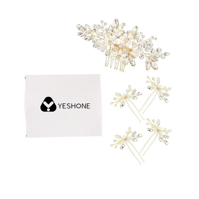 Yeshone 5 Pieces Wedding Hair Comb Bridal Hair Pins Crystal Pearl Hair Accessories Rhinestone Flower Hair Piece for Wedding Bride Women(Gold,Classic Style)