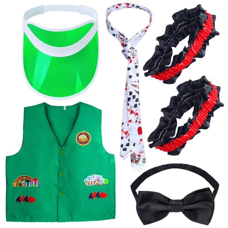 - Casino Dealer Costume - Classic casino dealer costume accessory set includes 1*green dealing visor hat, 1*vest,1* costume bowtie, 1 pair casino dealer armband and 1 piece poker necktie, enough accessories to meet your dressing needs on casino night