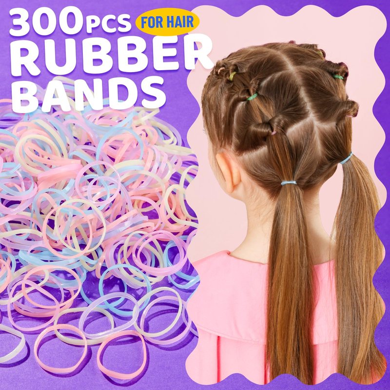 - 300PCS RUBBER BANDS FOR HAIR Come in a 300 count in assorted 5 candy colors to suit your wardrobe needs, Elastic hair band length is 30mm, thickness is 0.7mm. Premium elastic hair ties features a easy glide coating so they can be removed from hair effortlessly. Contains small topsy tail hair tool designed for kids' thin and soft hair. Ideal for braiding and styling, hair loop tool makes it easy to pull hair through creating unique and creative styles.