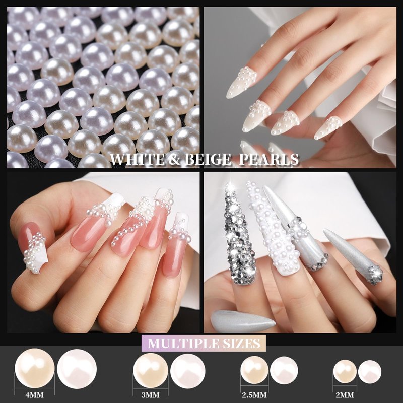 - FLAT-BACK HALF ROUND WHITE & BEIGE PEARLS Embellish your nails with tiny pearls! Come with 4 different sizes: 2/2.5/3/4mm, you can use nail pearls on nail, also can be attached to mobile phones, clothes, shoes, tablets, makeup art, etc. The mixed sizes can meet all your needs and bring you more surprise.Each pearl has a flat back, making it easy to apply and stick to any surface.Great for both professional nail specialist or nail art learner