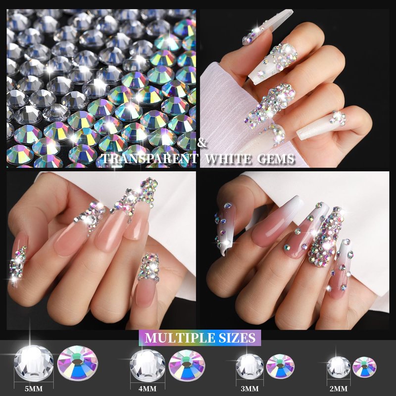 - TRANSPARENT & AB GEMS STONES Bling it on! Crystal Clear & AB Round Flatback Rhinestones will add shimmer and interest to your projects.Each come in 4 sizes, namely 2/3/4/5mm. Various sizes of gemstones are very suitable for DIY projects such as tumblers, cups, mugs, shoes and many other craft projects. The non-hot fix backing helps glue adhere to the crystal creating a strong bond to enhance the longevity of nail art.