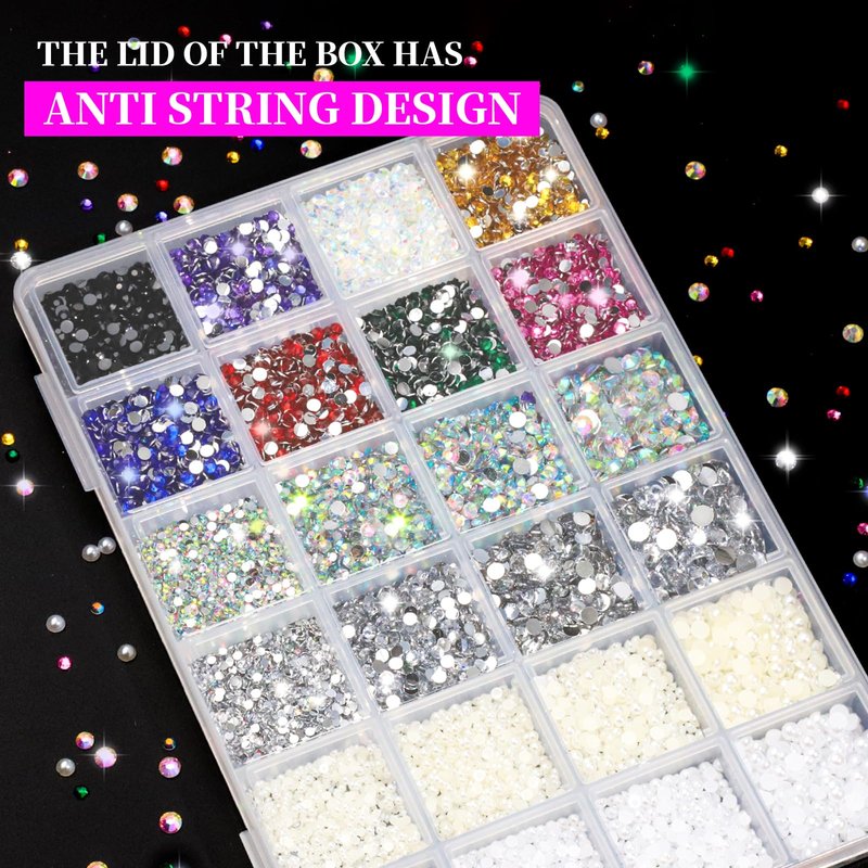 - 10000PCS RHINESTONE & PEARL KIT Add sparkle and shine to your projects with Flatback Rhinestones & Flatback Half Round Pearl ! 10000PCS of round resin rhinestones & pearl are enough for decorating your nail art, eye makeup, body art, phone, bags, greeting cards, clothes, high mesh stockings, shoes or other items.The nail accessories come with a 24 small grids box to avoid mixing different colors of rhinestones during use, for easy storage and carrying.