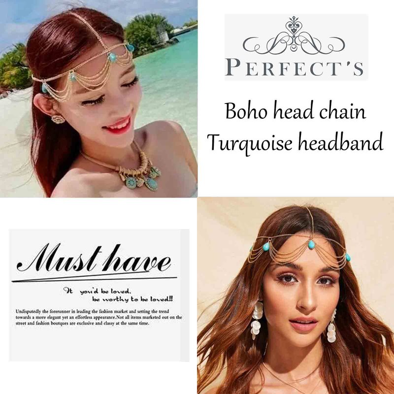 Yheakne Boho Turquoise Headband Gold Layered Tassel Head Chain Gypsy Hair Chain Festival Wedding Headpieces Decorative Headdress Hair Accessories for Women and Teen Girls Gifts