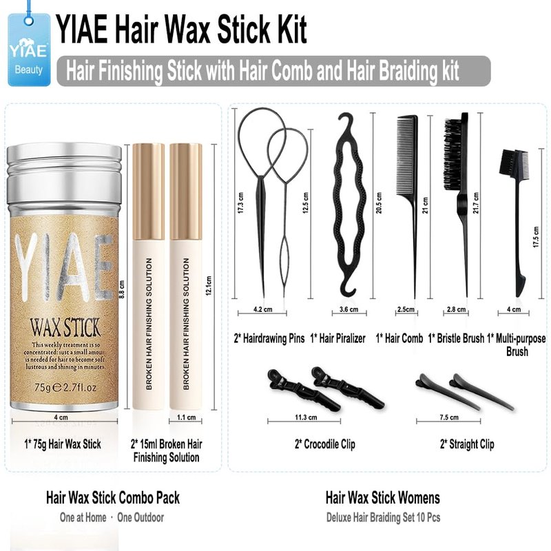YIAE Hair Wax Kit, Hair Wax Stick Womens and 2 Hair Stick for Flyaways with Hair Comb and Hair Braiding kit, Hair Accessories for Women with Non-greasy Pomade Gummy Wax for Edge Frizz Hair (75g+30ml)