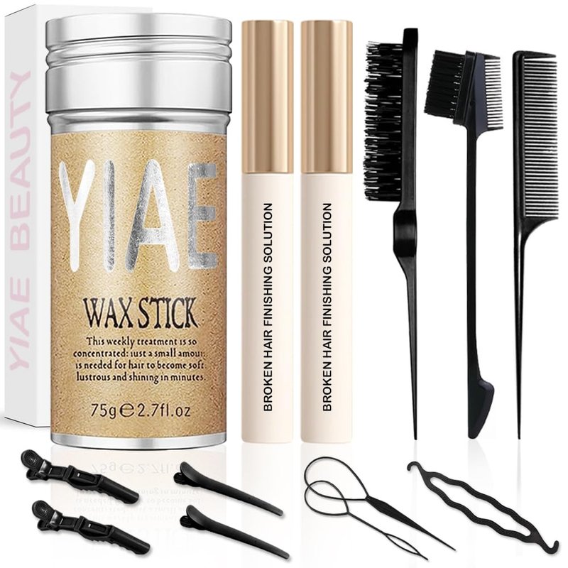 - 💖【Deluxe Topsy Tail Hair Tool Kit】 YIAE hair gel women with slick brush set and slick back hair products Includes: 75g wax stick hair + 2Pcs 15ml hair finishing stick + 10Pcs hair styling accessories (1 bristle brush + 1 Multi-purpose Brush + 1 pin-tail comb + 2 Hairdrawing Pins + 1 Hair piralizer + 2 Crocodile Clips + 2 One Clips)