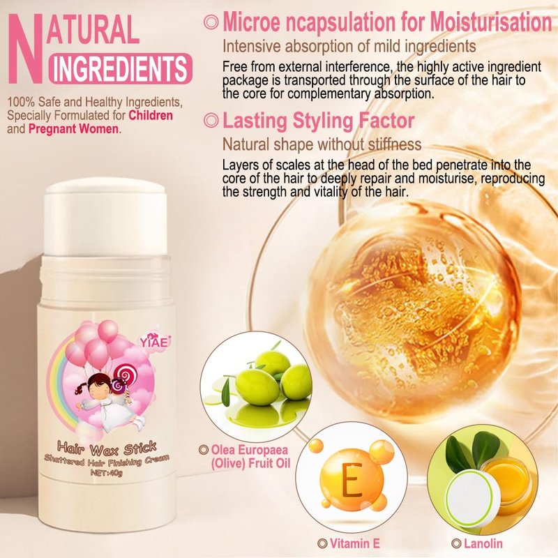 - 【Mild & Healthy】YIAE hair slick stick enriched with Olea Europaea (Olive) Fruit Oil, Vitamin E and other nutrients, it is gentle and safe for all hair types. Natural non-irritating, does not hurt hair, does not hurt the scalp, no residue, suitable for children and pregnant women. YIAE kids hair gel are soft and delicate in texture, easy to absorb, it's not greasy or oily at all