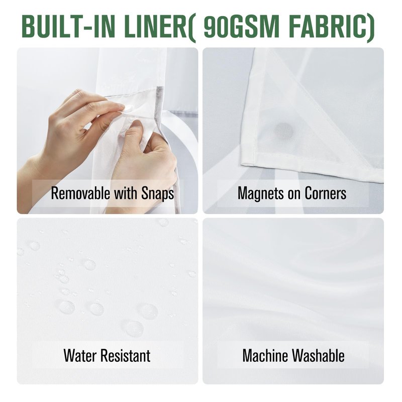 - 【Hight Quality and Eco Fabric】: The outer curtain is made of high-quality 100% polyester fabric. The snap-on fabric shower curtain liner is easily detachable. No hooks needed design with built-in rings for easy on and off making it convenient for cleaning or replacement.