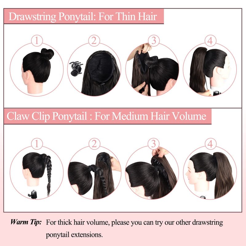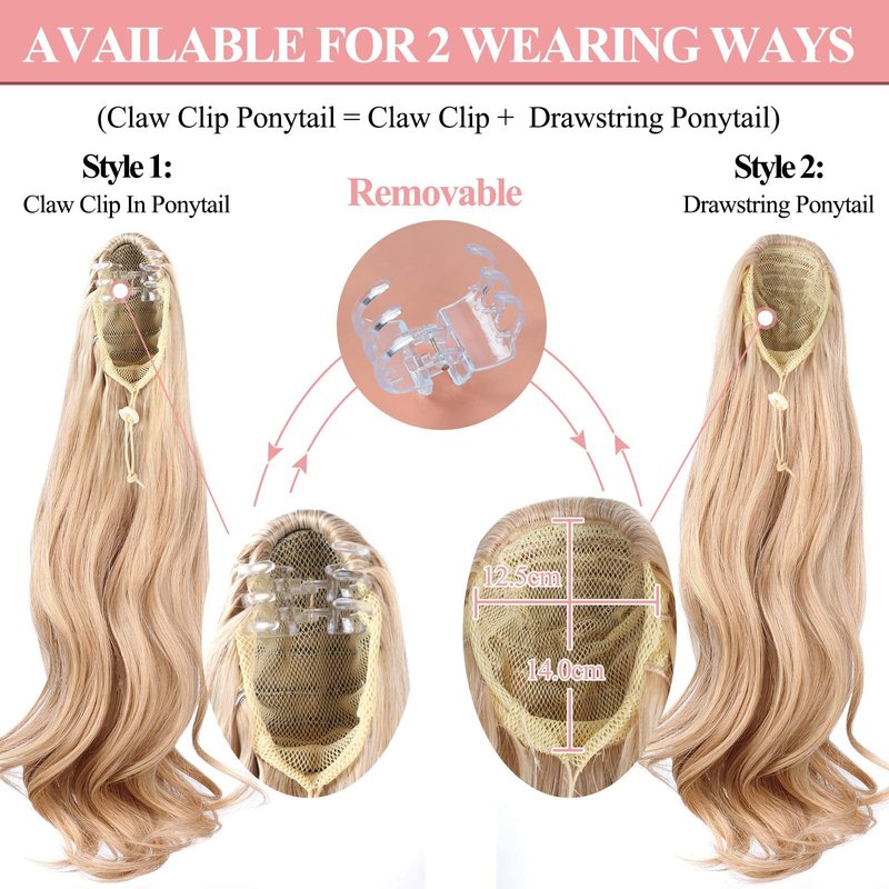 - 【Buy One Get Two Way】: Wave claw hair extensions ponytail are great for women with short hair and thin hair. Method 1: Ponytail with claw clip, you just open the claw clip at the top of the ponytail and clip it to your own ponytail; Method 2: Remove the Claw Clip from the ponytail and secure, Become a curly wave drawstring ponytail, fastened to the hair with a drawstring.If your hair is thick or long, we recommend you choose a 30" curly drawstring ponytail in our store.