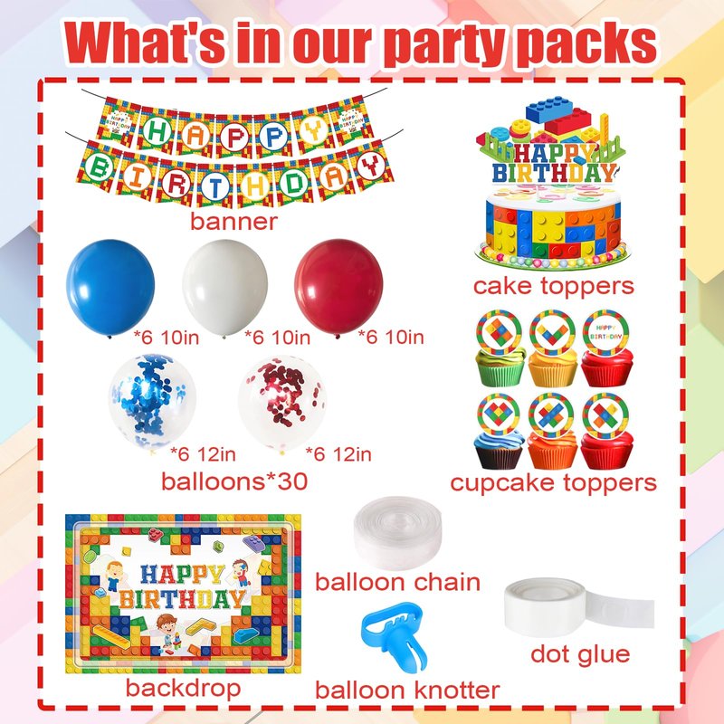 - Building Block Party Set: Our building blocks party supplies includes 30pcs latex balloons in four colors, 1pcs backdrop, 1pcs banner, 1pcs cake topper, 24pcs cupcake toppers, 1pcs dot glue, 1pcs balloon chain, and 1pcs balloon knotter—everything you need for a memorable party